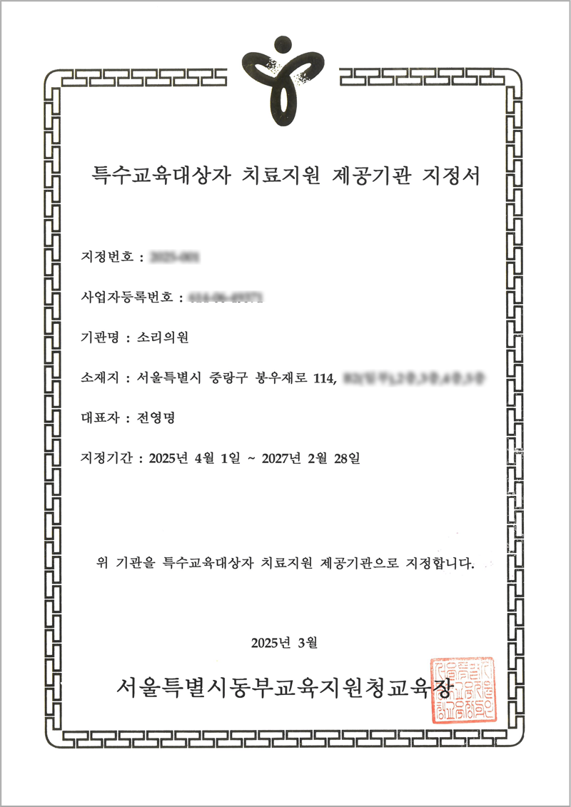 면목소리의원 특수교육대상자 치료지원 제공기관으로 지정되었습니다. 지정기간은 2025년 4월 1일부터 2027년 2월 28일까지이며, 해당 기간 동안 청각장애를 지닌 특수교육대상학생에게 적절한 음악치료가 지원될 예정입니다.
